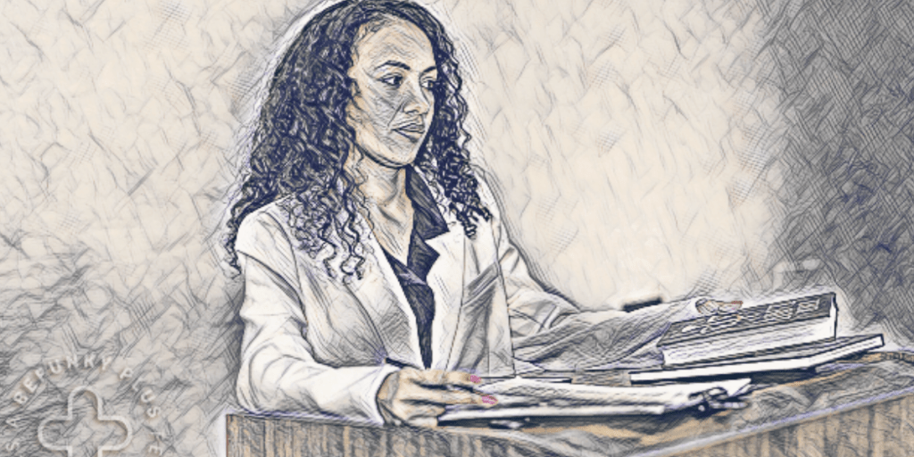 Concept: A judge, a prosecutor, a defendant, the courtroom deputy, the court report, and the witnesses. The professional term is called a courtroom sketch artist.